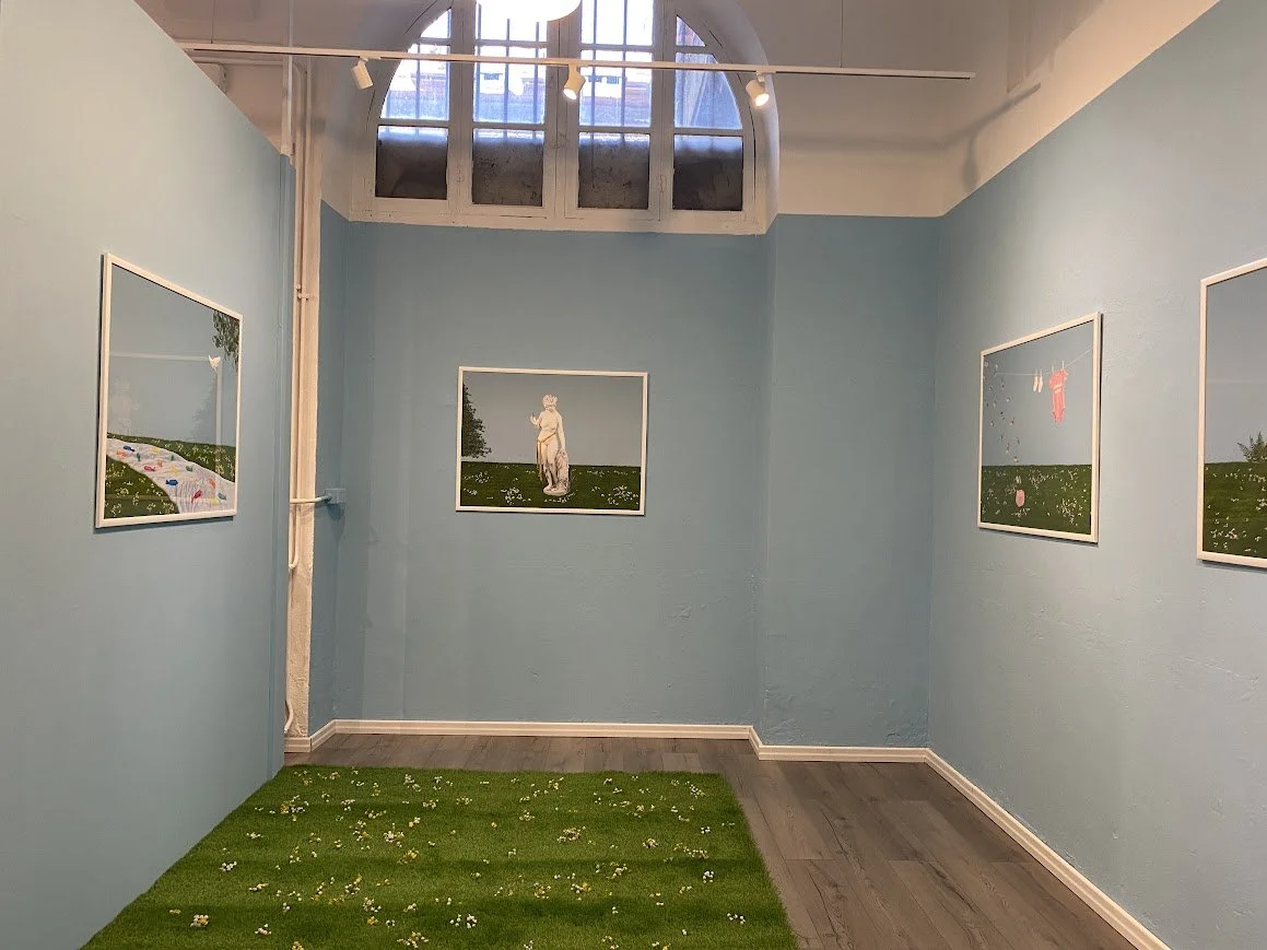 Marta Scavone è, a tutti gli effetti, un’artifex: colei che crea con arte, tecnica e visione. Le sue immagini sono artificiali, sì — ma nel senso più nobile del termine: fatte con arte, e dunque vere. Per l’occasione, la galleria si trasforma in un set a cielo aperto: le pareti si tingono di azzurro, il prato prende forma sotto i piedi e torna in vita l’allestimento originale della serie sulla maternità di Marta Scavone. Il pubblico è invitato a entrare fisicamente nelle sue immagini, attraversando il sottile confine tra finzione e realtà. Fili colorati percorrono lo spazio, intrecciando le opere in un unico racconto visivo. Manifesta finzione è una mostra da percorrere con lo sguardo e con il corpo, dove la fotografia diventa scena, spazio, esperienza.